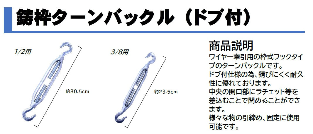 炭素鋼 ドブメッキ転倒防止・構造物の補強時のワイヤー張りを調整する商品名表記はインチとなります。【9.53mm】 開口部にラチェットやシノなどを差し込み、回転させ締める。